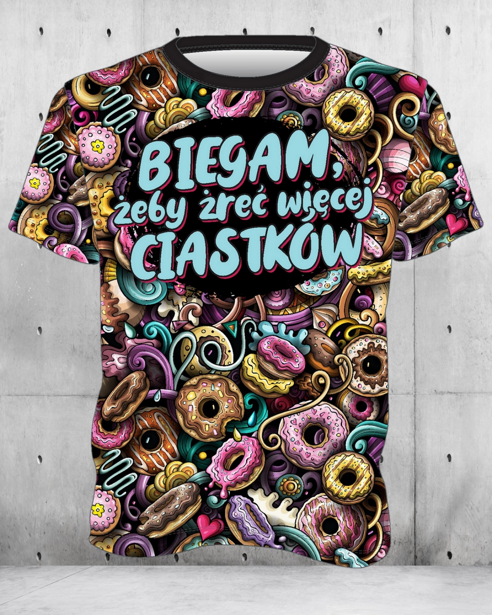 Techniczna koszulka "Biegam żeby żreć więcej ciastków", fullprint , uszyta w Polsce w 100% z lekkiego materiału poliestrowego, idealna do biegania i na trening.
