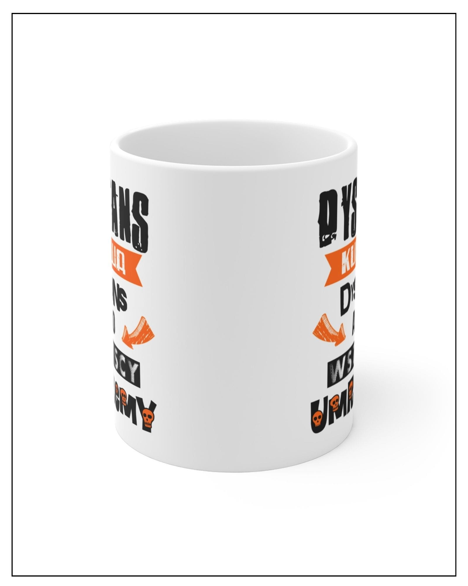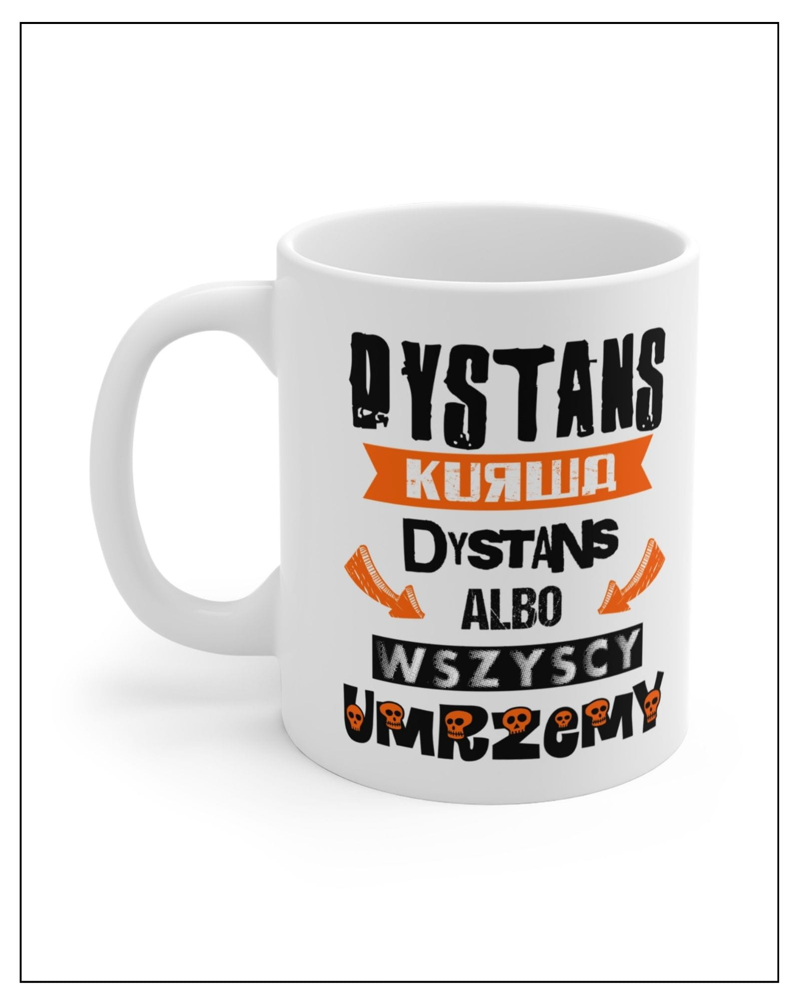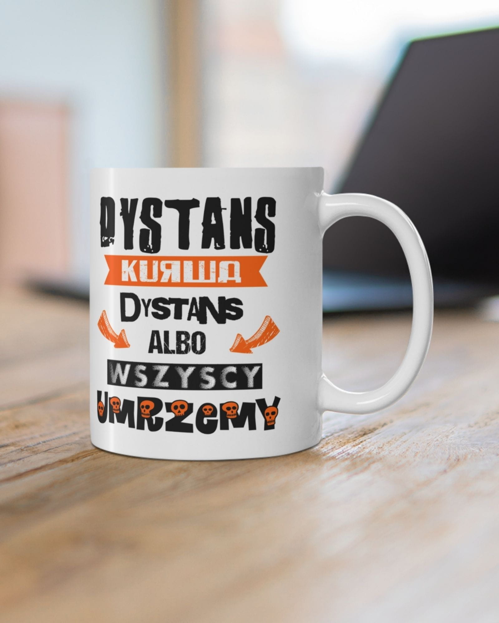Kubek biegacza z hasłem: Dystans. Ten biegowy kubek z zabawnym hasłem będzie idealnym prezentem dla biegacza, maratończyka, tudzież innego sportowca. Kubek z nadrukiem idealny na prezent dla biegacza.
